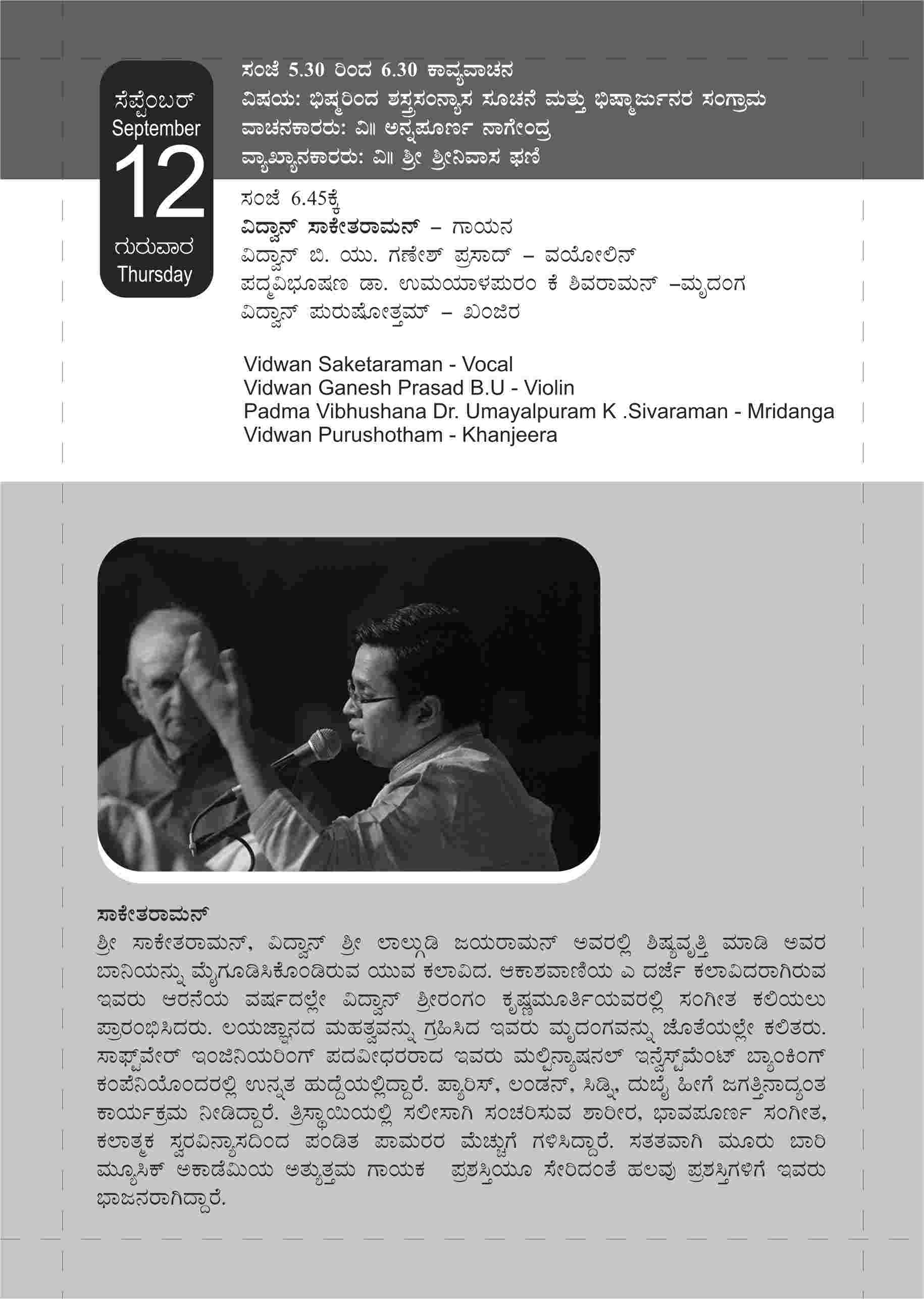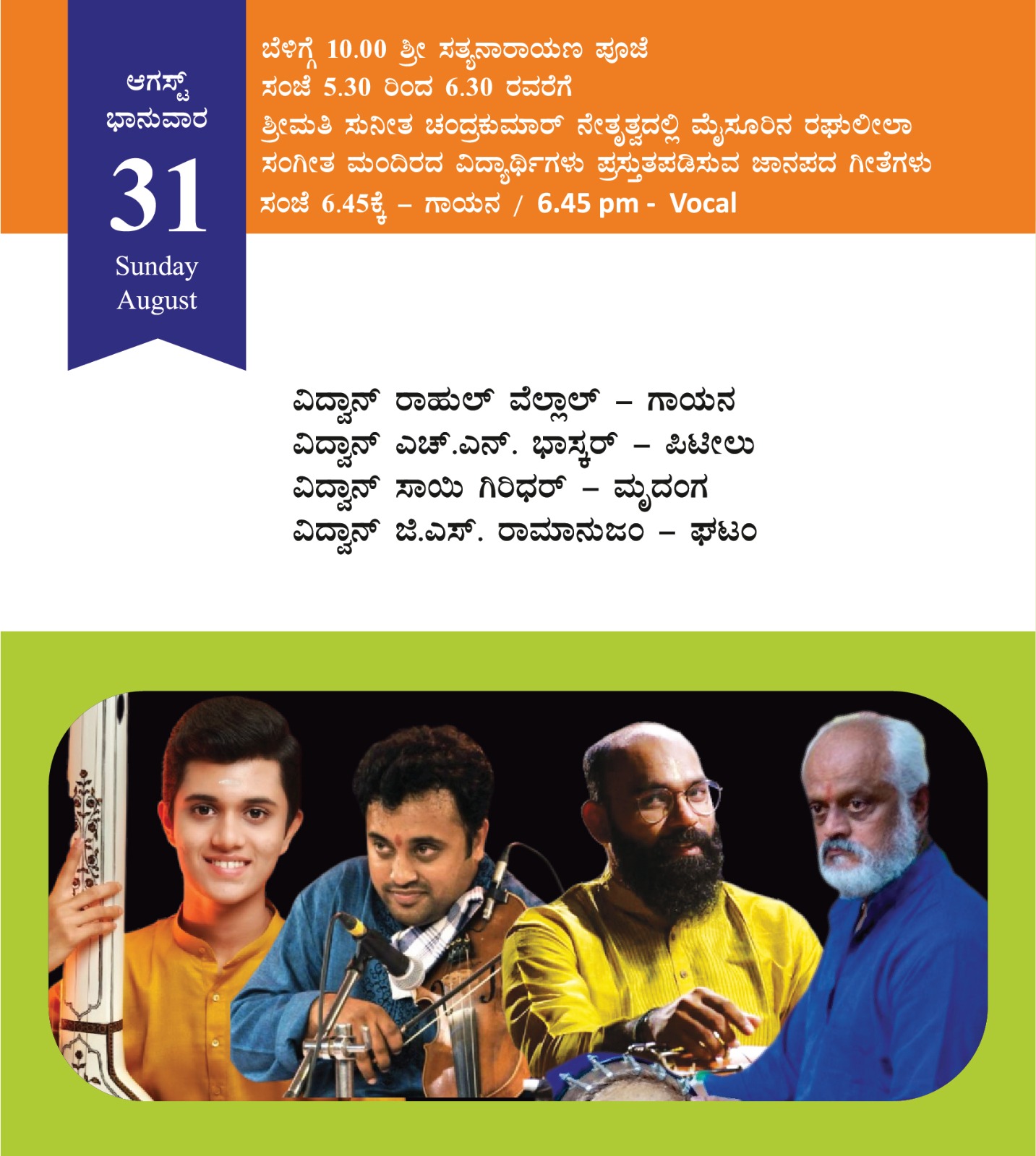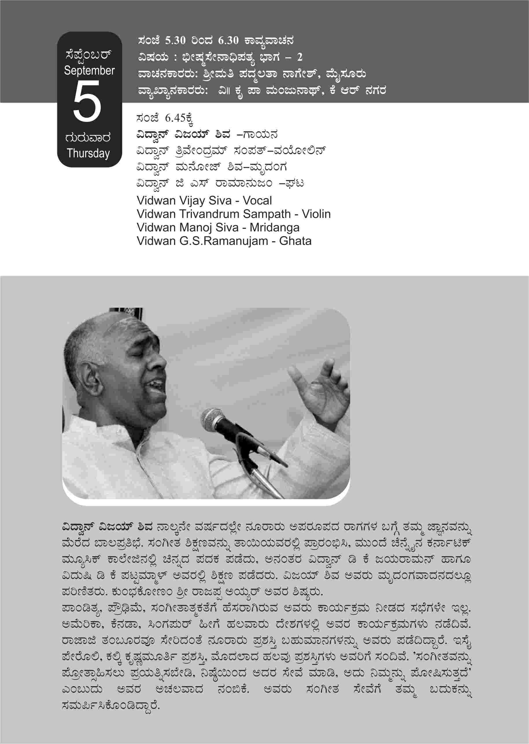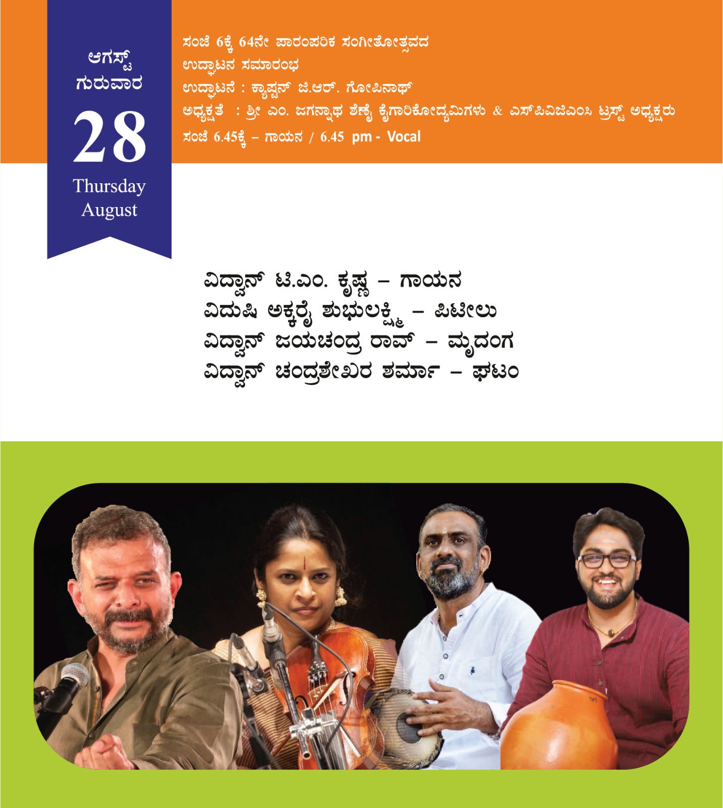 The SPVGMC Trust (R) was established in 1962 to celeberate Ganesha festival in a meaningful way. Over the years, it has acquired the hues of a prestigious Sangeeta Sabha. Main focus of the celeberation is the ten-day long Music festival. Sri Prasanna Vidya Ganapathi Mahotsava Charitable Trust (SPVGMC trust in short) or popularly known as Vontikoppal 8th cross Ganapathi, has come a long way in its musical path. In 2012 it celebrated its golden jubilee. The skeleton of the Ganapathi pendal here is a permanent one occupying a small stretch of 8th cross in Vontikoppal, which is also known as Vani Vilasa Mohalla. The pendal will be constructed every year on this skeleton, into a rain proof auditorium. Ganapathi will be installed in this pendal, in front of which the platform for the artistes will be made.